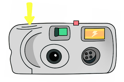 Look through the viewfinder. Press the button on top of the camera to take a photo.